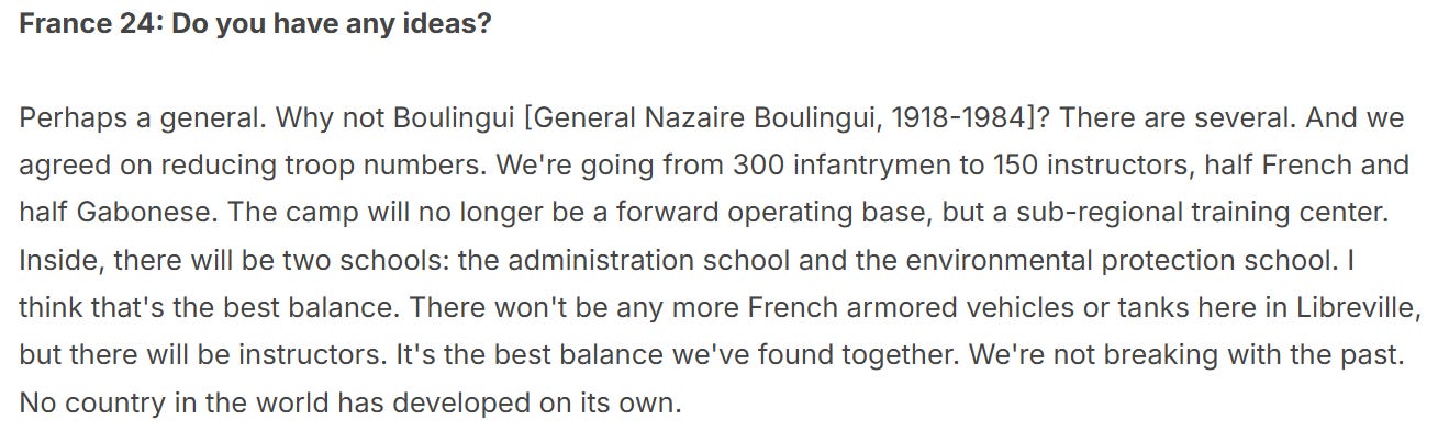 Al contrario, il Gabon rimase saldamente nel campo francese. Il primo leader del Gabon post-indipendenza (nominale), il presidente Leon M’ba, dichiarò con orgoglio: “Ogni gabonese aveva due patrie : la Francia e il Gabon”.
