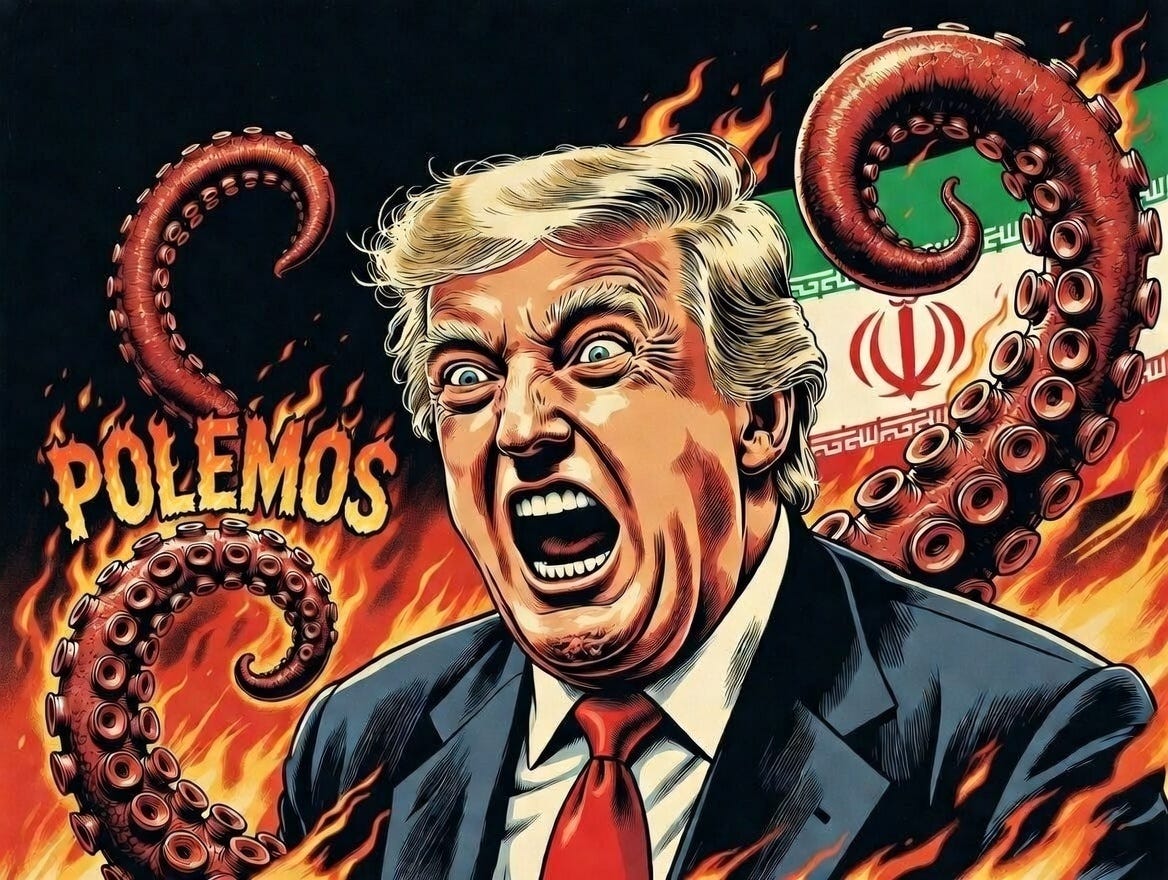 Favorevole alla guerra, i tamburi di guerra risuonano nel suo cervello offuscato dalle anfetamine; l’Iran, la tana velenosa, è stato provocato fino alla rabbia. 28 febbraio 2026: ha inizio il blitz statunitense-israeliano, “Operazione Epic Fury”, un bombardamento preventivo e immotivato che si trasforma in un delirio volto a rovesciare il regime: bunker vaporizzati, silos missilistici sventrati, il Leader Supremo Khamenei eliminato con un attacco chirurgico da drone, o forse non così chirurgico, dato che viene spazzata via anche metà della sua famiglia. Trump grida “vittoria” dopo una dozzina di giorni, ma il pantano lo inghiotte: la risposta di Teheran soffoca lo Stretto di Hormuz, il greggio schizza a 120 dollari al barile, i flussi di GNL vengono interrotti, le infrastrutture arabe e le basi statunitensi vengono incendiate in inferni scatenati dalla determinazione iraniana alla vendetta. 175 bambini polverizzati dalla macchina militare americana in un’apocalisse nel cortile di una scuola. Emorragia fiscale: miliardi bruciati nella prima settimana dal complesso militare-industriale americano, arterie commerciali deviate, stagflazione che rosicchia mentre il PIL si arresta, prezzi al consumo alle stelle. Colpire l’Iran? Distrugge il mandato di Trump. Non una crociata di ideali ma un’assurdità tardo-imperiale: il potere americano scagliato attraverso sabbie lontane mentre il bottino si accumula altrove e il cuore dell’impero marcisce silenziosamente. Un impero inizia la sua caduta non quando perde le guerre, ma quando le combatte a beneficio di altri. Il conflitto come una mischia umida nell’Interzona, milizie che lanciano droni come proiettili narcotici, la superpotenza che sanguina nelle paludi mesopotamiche. Il «tessuto prodigioso» dell’impero cede alle ferite autoinflitte. L’avventurismo di Trump è parallelo alla critica di Gibbon all’arroganza imperiale, dove «le cause della distruzione si moltiplicavano con l’estensione della conquista».