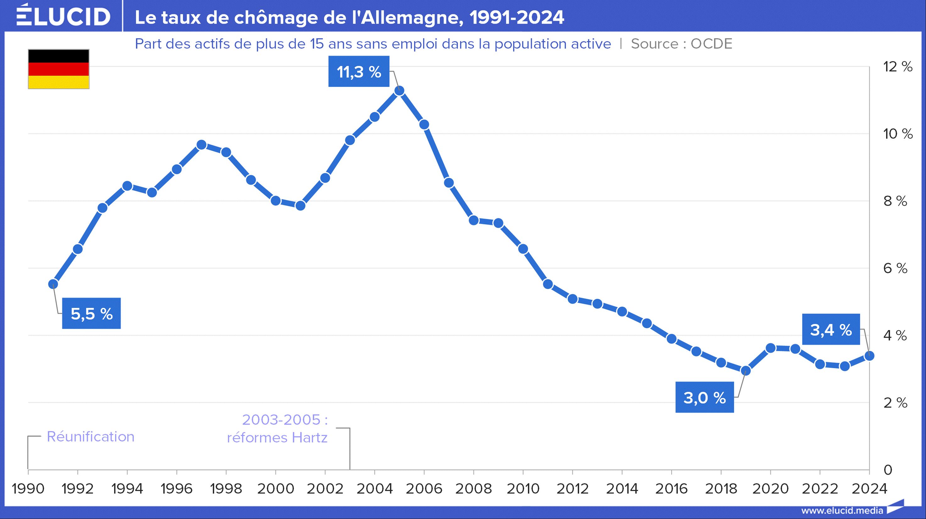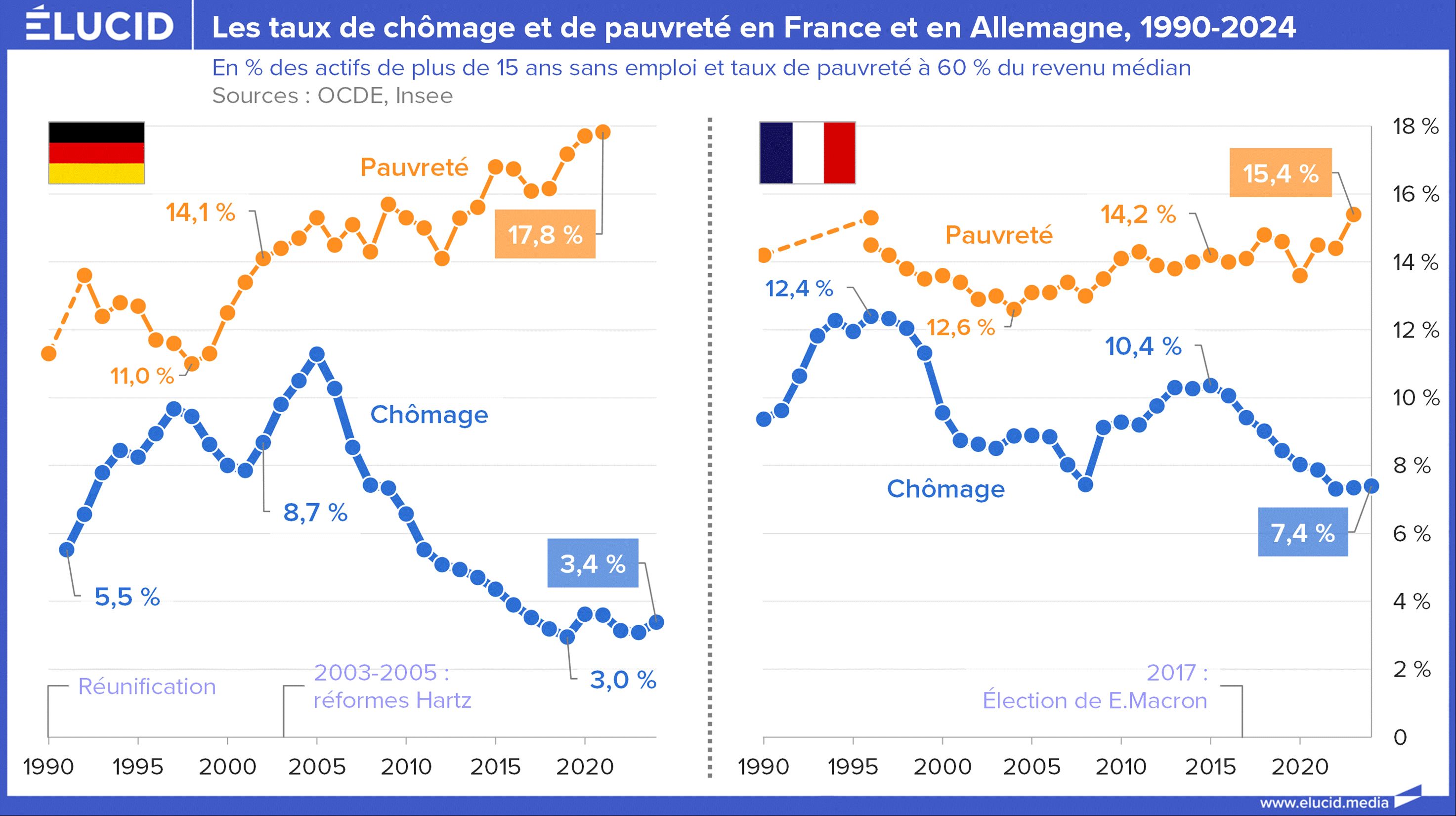 Al di là del Reno, le riforme Hartz hanno allentato le regole sul lavoro temporaneo e hanno sviluppato mini jobs con un salario massimo di circa 500 euro, attraverso una riduzione dei contributi sociali. Hanno inoltre introdotto i ” jobs ” che pagano 1 euro all’ora nei settori pubblico e caritativo. Oltre al vantaggio di fornire al settore pubblico manodopera a bassissimo costo, queste riforme hanno reso i disoccupati ancora più precari e hanno contribuito a ridurre le statistiche sulla disoccupazione, con i disoccupati di lunga durata che non possono rifiutare un lavoro pagato 1 euro l’ora o rischiano di perdere i loro sussidi.