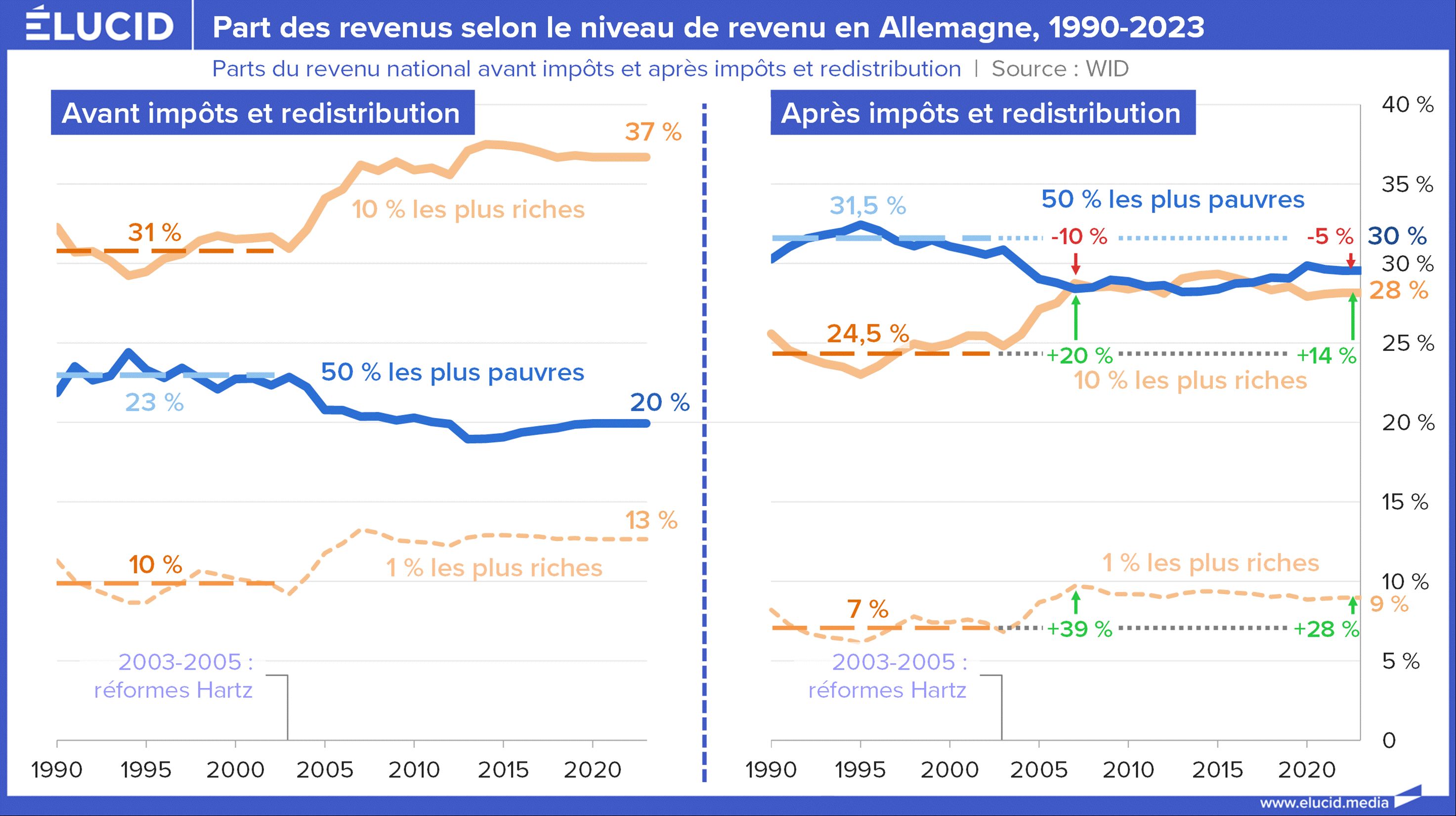 Quattro anni dopo l’inizio delle riforme Hartz, la quota di reddito spettante al decimo più ricco dei tedeschi era aumentata di quasi il 20% al netto delle imposte. Al contrario, la metà più povera della popolazione ha visto la propria fetta di torta ridursi del 10%. I grandi vincitori sono stati i membri dell’1% più ricco che, due decenni dopo, hanno preso il 2 % del reddito nazionale, portando la loro quota al 9 %, con un aumento complessivo di quasi il 30 %. Grazie ai mini posti di lavoro e ai posti di lavoro da 1 euro, il Santo Graal della piena occupazione in Germania è stato raggiunto!