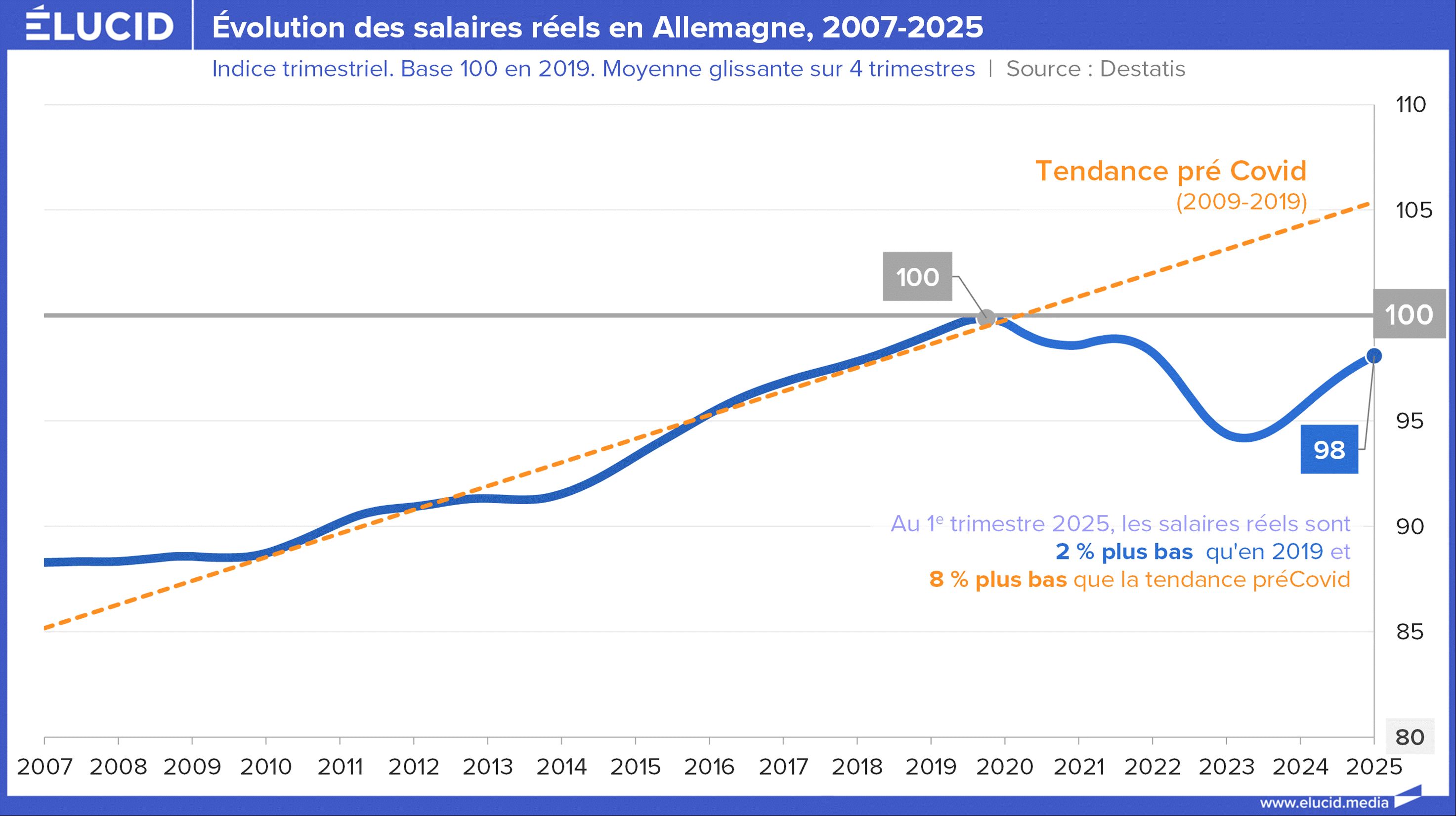 Questo andamento delle esportazioni pesa sullo sviluppo dei vicini europei, ma anche sui tedeschi stessi. ” L’allentamento delle politiche salariali va quindi a scapito della popolazione tedesca. Nonostante alcuni aumenti nel 2024, i salari reali sono ancora 8 % al di sotto del loro trend pre-pandemico, e ai livelli del 2017.