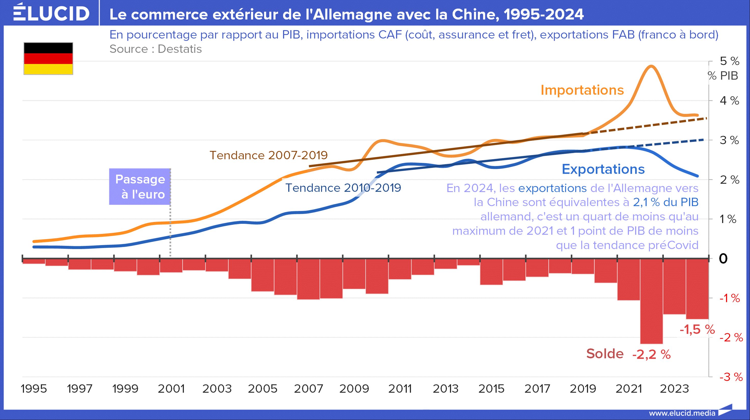 La Cina ha aderito all’Organizzazione mondiale del commercio (OMC) nel 2001. All’epoca, la concorrenza cinese, incentrata sull’elettronica di consumo, sui mobili, sull’abbigliamento e sugli elettrodomestici, non minacciava la Germania, che esportava automobili e prodotti di ingegneria. Per essere competitive, le aziende tedesche stanno ” ottimizzando ” i loro costi moderando i salari e sviluppando catene di approvvigionamento nell’Europa centrale e orientale.