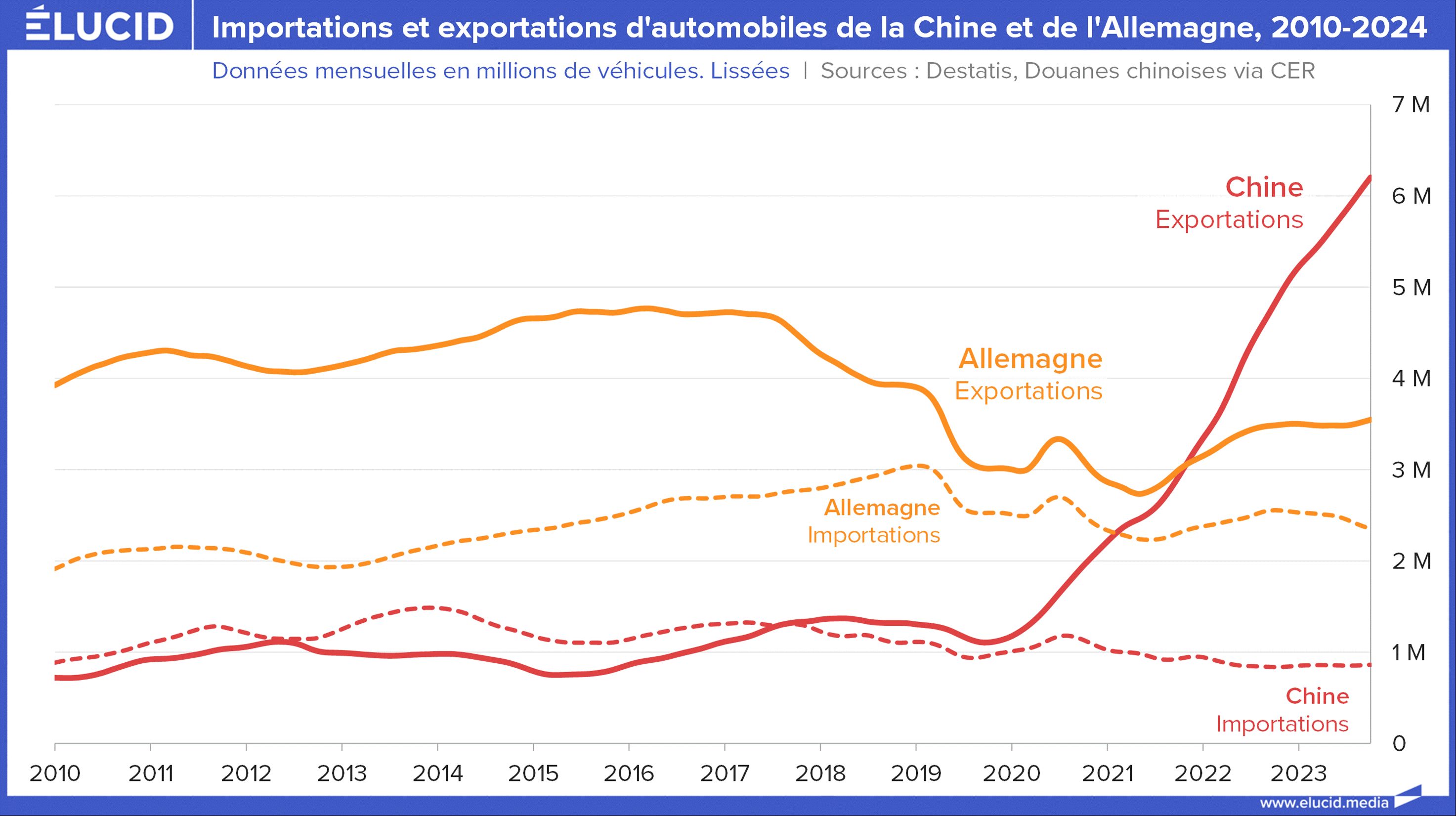 Nel settore automobilistico, la Cina è diventata un esportatore netto di veicoli con 5 milioni di veicoli in più rispetto a quelli importati. La Germania esporta ancora 1,2 milioni di auto, ma è la metà del suo picco pre-pandemia.