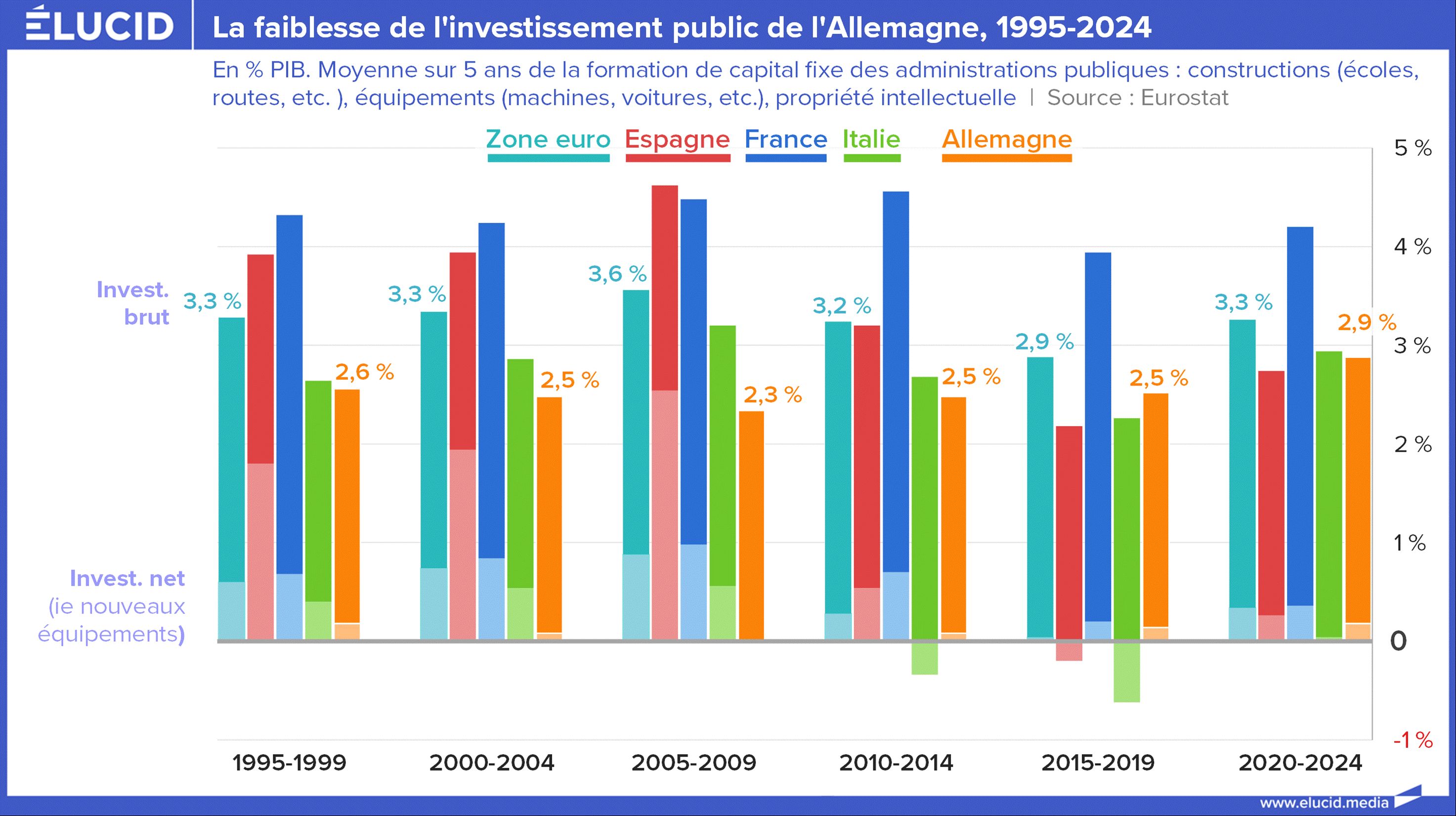 Infine, se la Germania sta arrancando economicamente, è anche a causa del suo cronico sottoinvestimento pubblico, con la spesa pubblica limitata dalla regola costituzionale nota come ” freno al debito “. Dalla crisi finanziaria del 2008-2009, la Germania ha mantenuto limiti severi alla spesa, limitando il deficit pubblico allo 0,35 % del PIL.