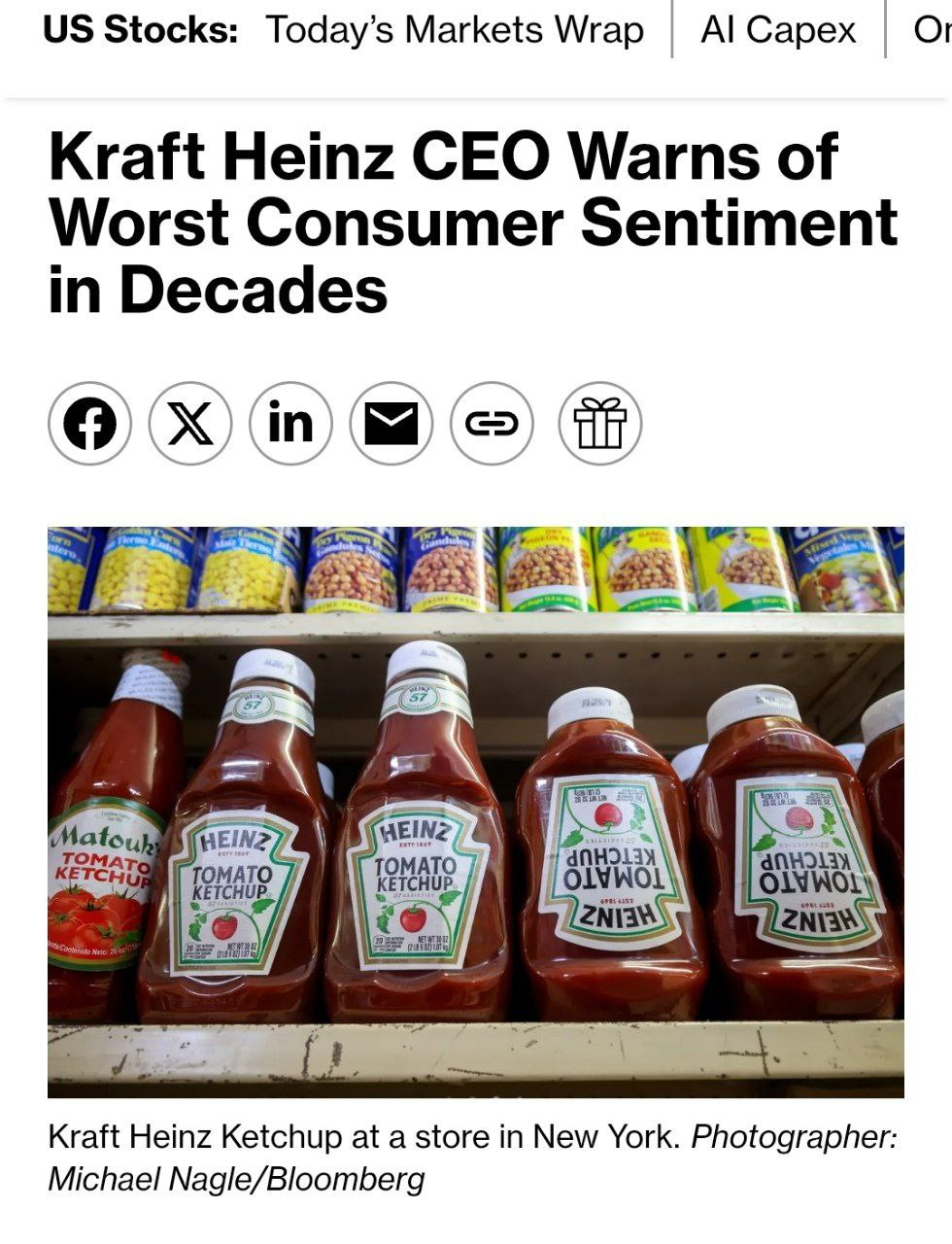 Gli Stati Uniti stanno affrontando una crisi dei consumi. Uno dei maggiori produttori alimentari del mondo, Kraft Heinz, afferma che gli Stati Uniti si stanno avvicinando alla peggiore recessione della storia, poiché i consumatori non acquistano nemmeno i prodotti alimentari di base.
