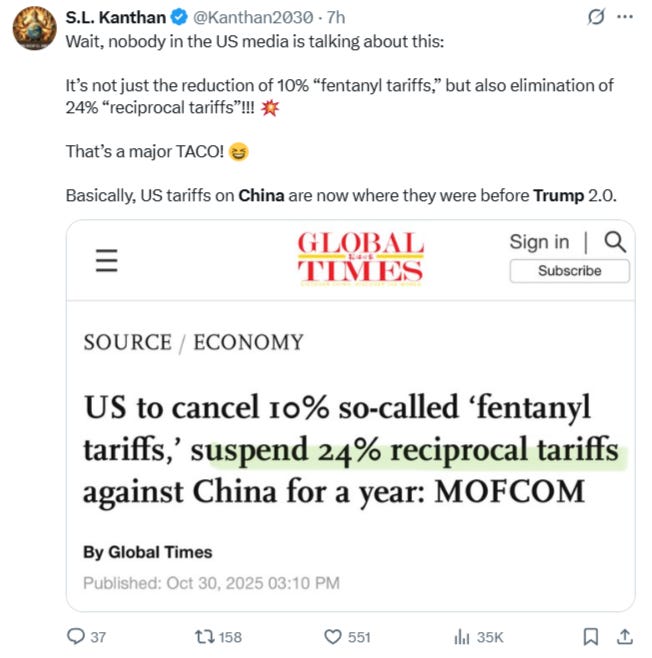 L’osservatore della Cina Arnaud Bertrand ha svolto un’analisi approfonditadi ciò che è effettivamente accaduto e di chi ha beneficiato delle distensioni concordate tra Trump e Xi. Kathleen Tyson ne aveva un’altra, ancora più dettagliata.