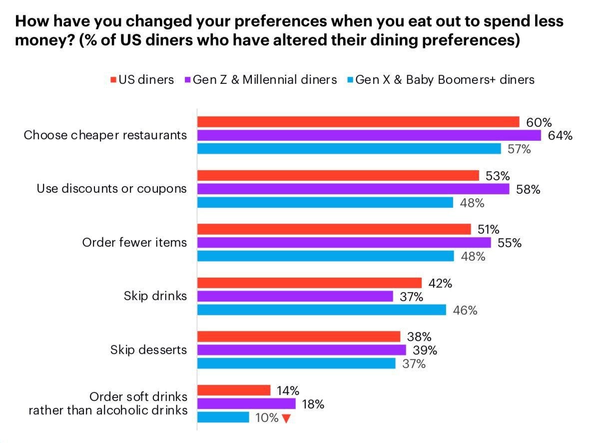 Gli operatori hanno lanciato più di 40.000 offerte di sconto, un numero record, nel tentativo di attirare i clienti che non tornano. Ma aumentare gli importi degli assegni non può risolvere il problema del traffico. Quasi il 40% degli americani mangia meno fuori casa e la metà delle persone a basso reddito taglia le spese.L’82% afferma che i prezzi dei ristoranti sono in forte aumento e un quarto definisce l’aumento ingiustificato.