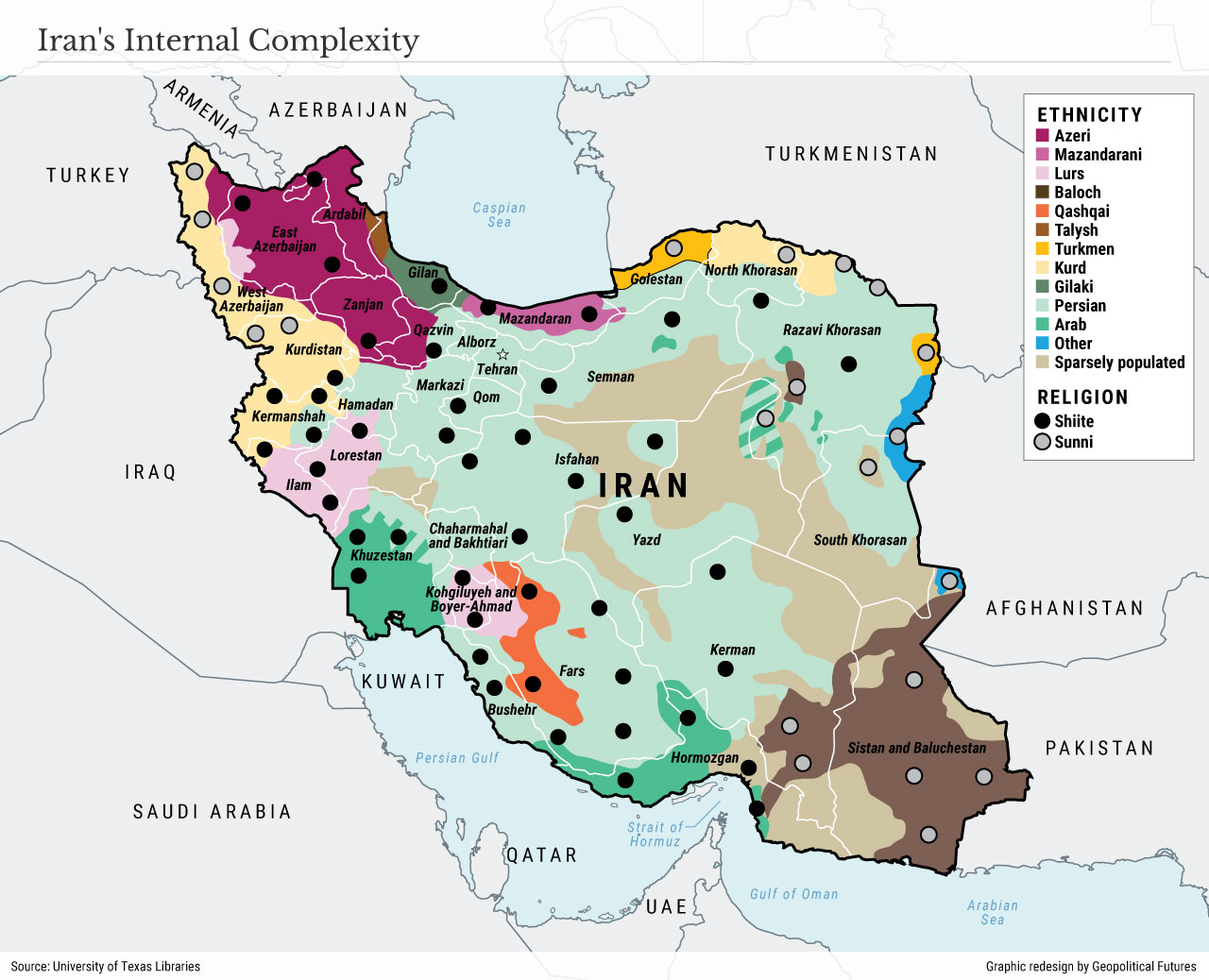 La mappa mostra anche quanto l’Iran sia circondato da paesi confinanti che, ciascuno a modo proprio, rispecchiano la sua diversità.