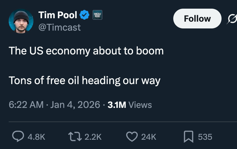 L’ex anti-interventista Tim Pool ha affermato che l’economia americana vivrà un “boom” perché “tonnellate di petrolio gratuito stanno arrivando”.
