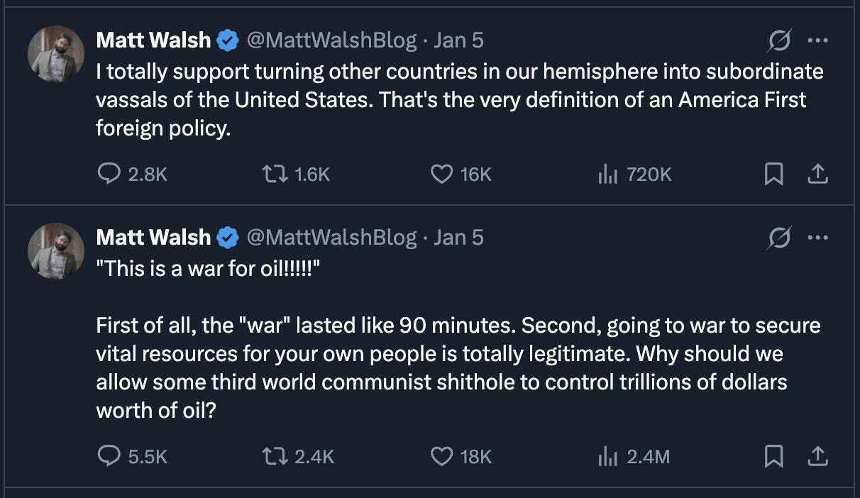 Diversi influenti esponenti conservatori sembrano essere in vena imperialista. Persino i sedicenti anti-interventisti hanno accolto con favore il fatto che l’operazione di questo fine settimana fosse basata sugli interessi americani, piuttosto che sul diritto internazionale, sui diritti umani o sulla promozione della democrazia. “Sono un non interventista istintivo come chiunque altro, ma il Venezuela sembra essere una vittoria clamorosa e una delle operazioni militari più brillanti nella storia americana”, ha scritto Matt Walsh del Daily Wire domenica. “Da sciovinista americano senza remore, voglio che l’America domini questo emisfero ed eserciti il suo potere per il bene del nostro popolo”.