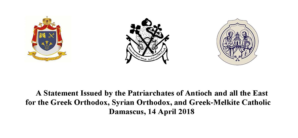 Noi, i Patriarchi: Giovanni X°, Patriarca greco-ortodosso di Antiochia e di tutto l’Oriente, Ignazio Aphrem II°, Patriarca Siriaco Ortodosso di Antiochia e di tutto l’Oriente, e Giuseppe Absi, Patriarca Melchita-greco cattolico di Antiochia, Alessandria e Gerusalemme, condanniamo e denunciamo la brutale aggressione che ha avuto luogo questa mattina contro il nostro prezioso Paese, la Siria, da parte degli Stati Uniti, dalla Francia e dal Regno Unito, con l’accusa secondo cui il governo siriano avrebbe usato armi chimiche. Leviamo le nostre voci per affermare quanto segue:
