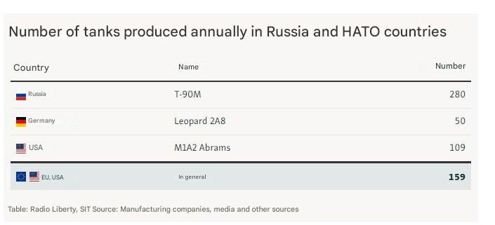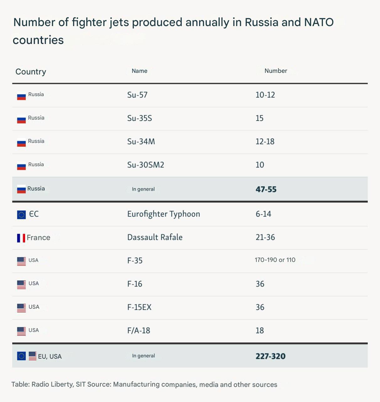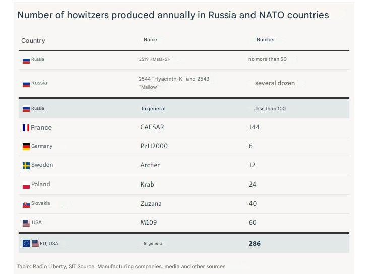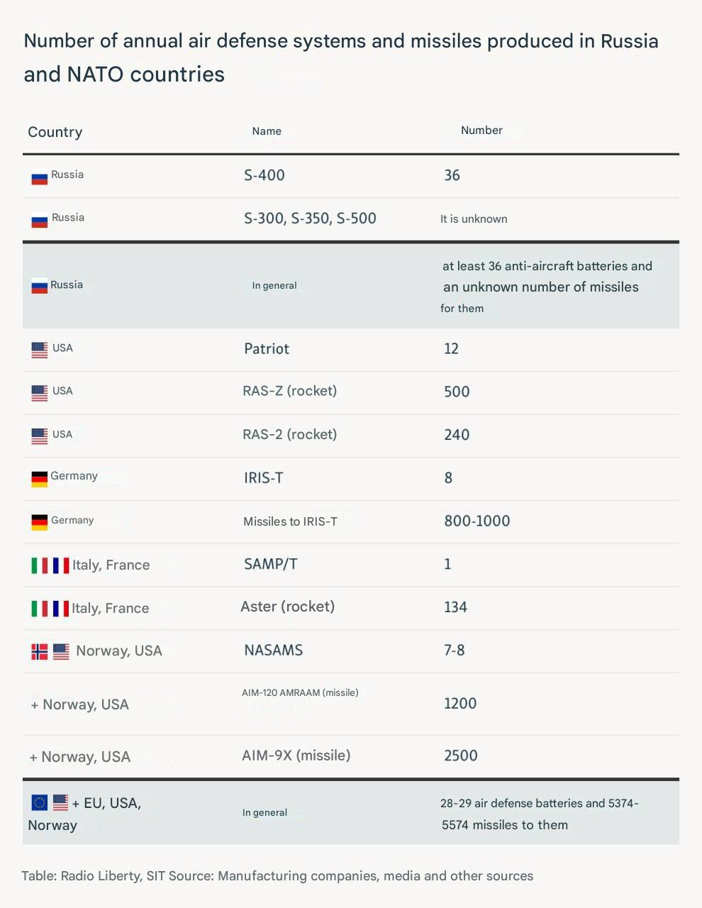 Radio Liberty ha pubblicato una nuova interessante stima della produzione di armi russe rispetto a quelle della NATO, che copre diverse categorie. Dalle mie stime sembra relativamente accurata.