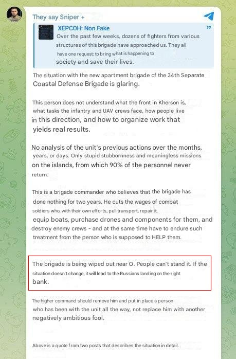 Un’ultima lamentela dai canali ucraini riguarda le brigate, in particolare la 34ª che opera sul Dnieper, che vengono spazzate via in assalti insensati, proprio come Khrynki tempo fa. In particolare, egli osserva che se non si fa nulla, saranno completamente spazzate via e le forze russe sbarcheranno sul lato di Kherson della riva: